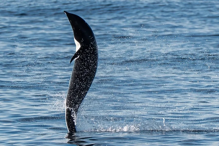 As imagens mostram um golfinho-baleia-franca-do-norte (Lissodelphis borealis) se posicionando verticalmente nas águas californianas por alguns segundos, utilizando seu rabo para se equilibrar. Embora outros membros da espécie estivessem presentes, apenas um decidiu se mostrar para as câmeras.