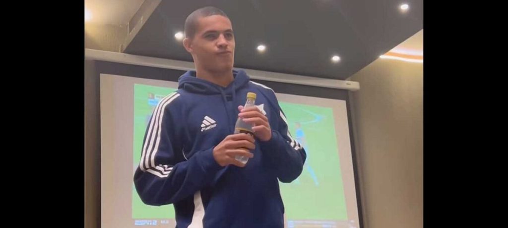 Considerado uma das grandes promessas da base do Cruzeiro, o lateral-esquerdo Kauã Prates foi alvo de um ‘trote’ de seus colegas na noite desta terça-feira (6), enquanto a equipe se prepara para enfrentar o Mushuc Runa na Copa Sul-Americana, no Equador. Durante a concentração no hotel, antes do jantar, Kauã teve que subir em uma espécie de palanque, fazer uma apresentação para o time e responder a algumas perguntas dos jogadores. Um vídeo compartilhado nas redes sociais pelo atacante Kaio Jorge mostra a diversão dos atletas quando o lateral menciona ter apenas 16 anos.