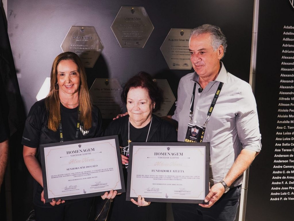 Neste domingo (5/4), a Arena MRV foi palco de uma homenagem emocionante a Dona Alice Neves, figura fundamental na história do Atlético. Mãe de Mário Neves, um dos 22 fundadores do clube em 1908, ela recebeu honrarias do Instituto Galo, junto a seu filho que também foi condecorado. A cerimônia, realizada no Salão Nobre de Homenagens, contou com a presença de importantes figuras do clube, como Maria Alice Coelho, presidente do Instituto Galo, e Sérgio Coelho, presidente do Atlético.