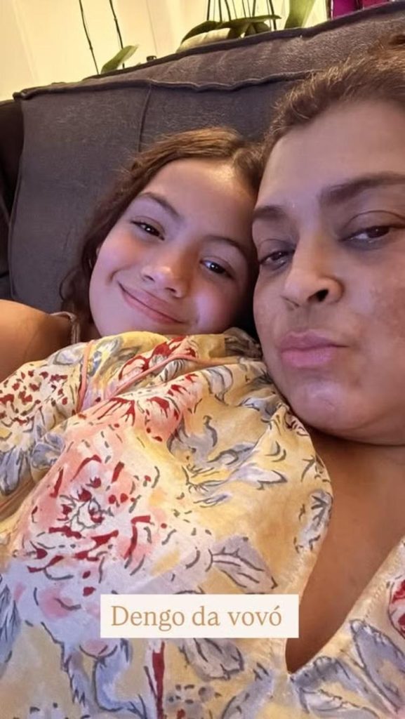 A cantora Preta Gil, aos 50 anos, foi visitada por sua neta, Sol de Maria, de 8 anos, logo após deixar o Hospital Sírio Libanês, onde ficou internada nos últimos dias. Em um gesto carinhoso, ela postou uma foto ao lado da pequena, legendando: “Meu dengo”. A imagem foi publicada em seus stories no Instagram. Sol é filha de Francisco Gil, 30, e de sua ex-mulher, Laura Fernandez. Francisco e Laura se separaram em 2020, e ele recentemente iniciou um relacionamento com a ex-BBB Alane Dias, de 25 anos. Preta recebeu alta na última quarta-feira e continuará seu tratamento nos Estados Unidos. Ela foi internada no Sírio Libanês no domingo para realizar exames de rotina.