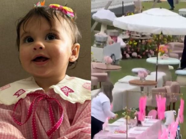 As primeiras fotos do evento ao ar livre, divulgadas pelo portal LeoDias, mostram uma decoração encantadora, repleta de elementos florais e em suaves tonalidades de rosa e amarelo, que reforçaram a proposta do tema. Na entrada, um letreiro feito inteiramente de flores cor-de-rosa com as iniciais da pequena dava as boas-vindas aos convidados.