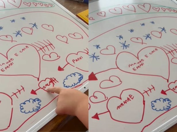 No vídeo, Clara mostra as palavras que escreveu e diz: “Olha! Aqui eu fiz mamãe, aqui eu fiz papai, aqui eu fiz Cacá”. Tatá pergunta: “E você escreveu tudo sozinha?”, ao que a menina afirma: “Aham”.