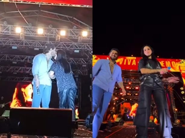 A boiadeira, além de cantar algumas músicas com Zé Felipe, interagiu com os fãs e animou o público que gritava “beija”. A presença da artista ainda rendeu momentos fofos entre os dois: ela entregou um presente de um fã para o cantor, que retribuiu com um beijo carinhoso em sua testa.