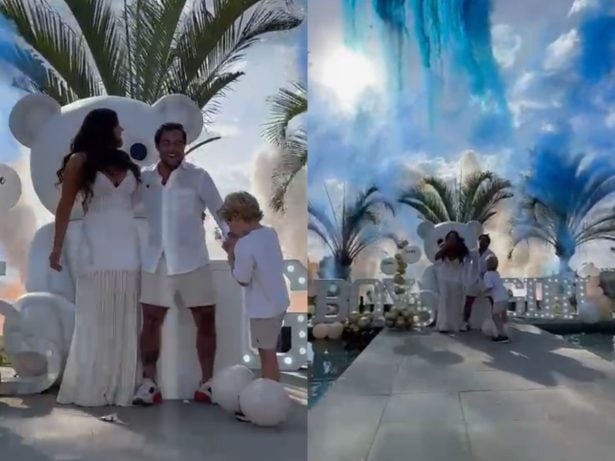 As emoções estavam à flor da pele quando o casal, vestido de branco, foi surpreendido pela fumaça azul, contrariando suas expectativas e trazendo lágrimas de alegria. Eles se abraçaram, celebrando a notícia ao lado de Bento, seu primogênito de 5 anos.