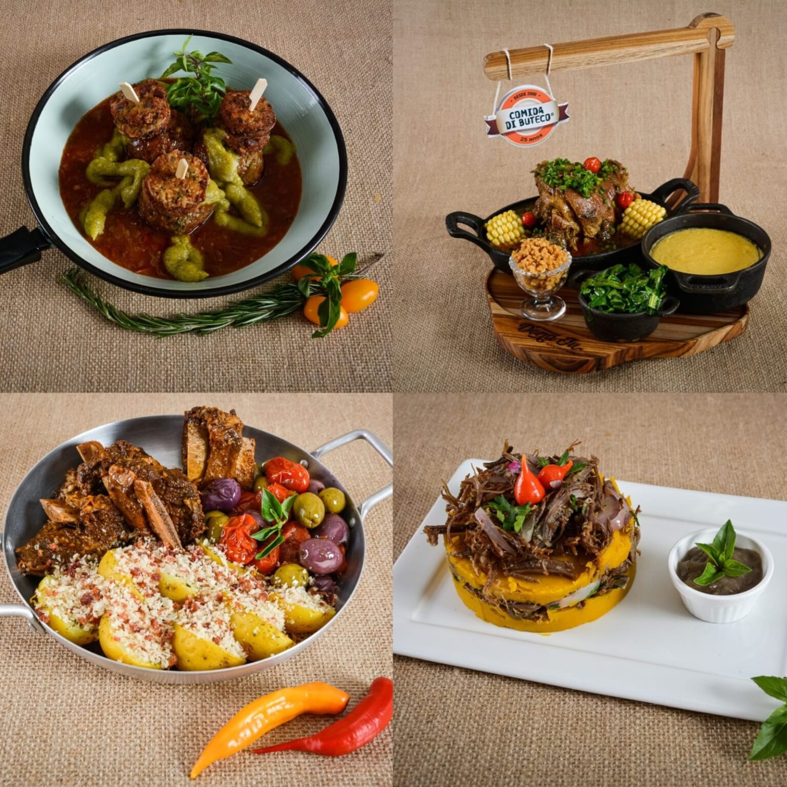 Bodas de Prata: Polpetas de carne recheadas com queijo, servido sobre aligot de batata e molho de tomates rústico, gratinado e guarnecido de crispy de jiló e picles de cebola-roxa.