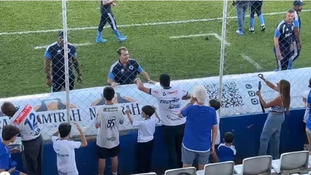 Antes do início da partida, Pedrinho se aproximou da grade que separa o campo das arquibancadas e fez questão de registrar momentos com os torcedores que estavam presentes. As fotos foram capturadas pela equipe de reportagem da Itatiaia.