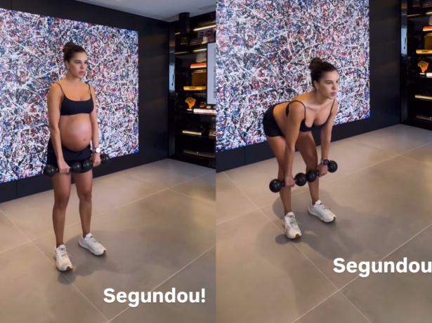 Nos stories do Instagram, Mariana apareceu usando um top e um shortinho que destacavam sua barriguinha de grávida. Ela realizou uma série de exercícios com pesos e elásticos, sempre sob a orientação de um profissional.